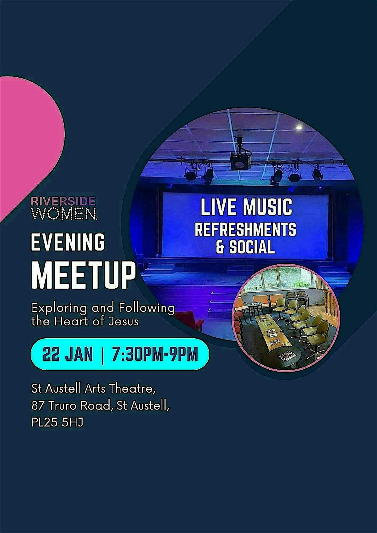 Welcome to the Riverside Women Evening Meetup! Join us for a relaxed night of live music and friendship at the St Austell Arts Centre. This is a gentle, welcoming space to find peace, encouragement, Scripture, prayer, community and open conversations where all questions are welcome. Whether you're new to the area or have lived here for years, come along and make some new friends. We can't wait to see you there!