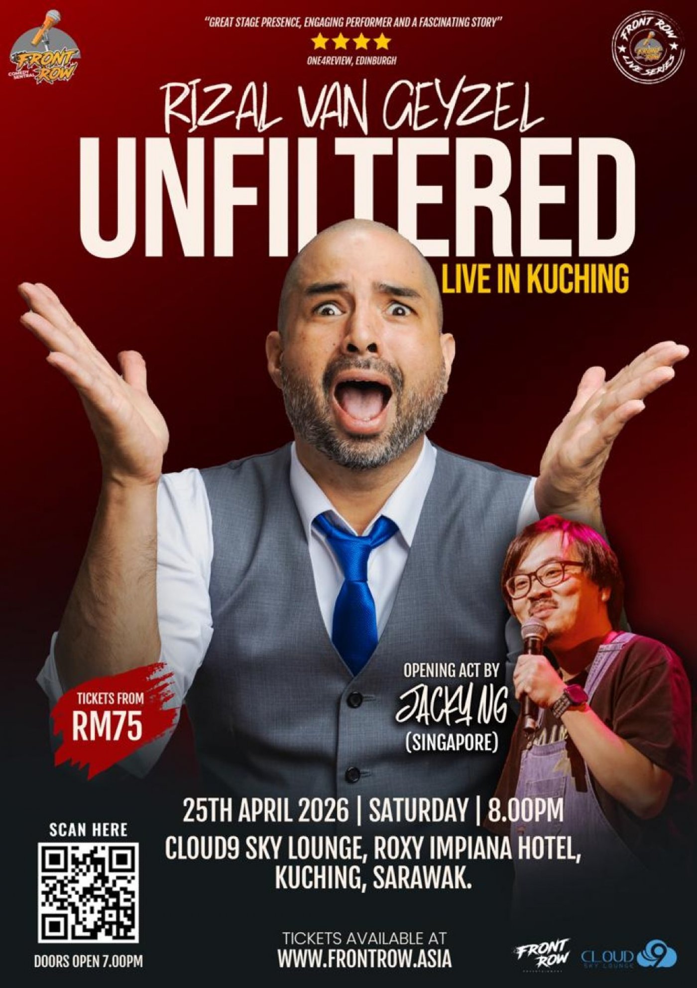 Front Row Comedy Sentral presents Rizal van Geyzel's "Unfiltered". Rizal is a prominent figure in the Malaysian stand-up comedy scene. With mixed Malay, Chinese, and Eurasian heritage, he often uses his multicultural background to provide sharp, observational humor on the quirks of Malaysian life.