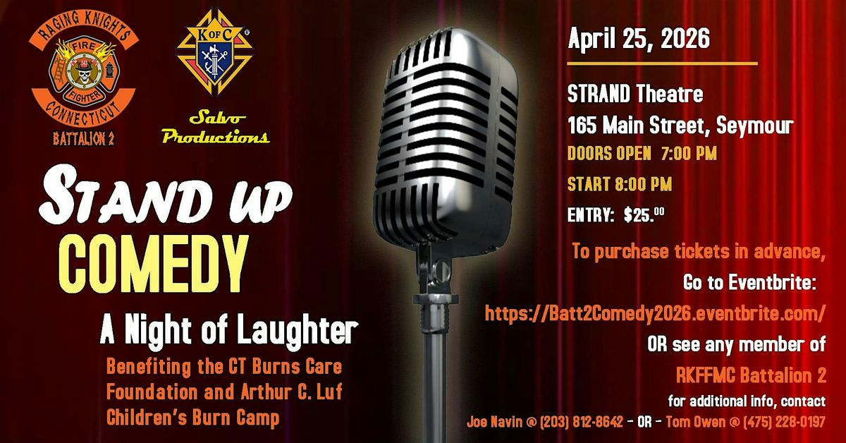 The guys from RKFFMC Battalion 2 in conjuction with the Knights of Columbus Aroura Council #53 and Salvo Productions present out annual Comedy Fundraiser for the Connecticut Burns Care Foundation and Arthur C Luf Children's Burn Camp. We will have a great linup of comedians from CT and the greater New York & New England region! Come on out and get your laugh on! Doors open at 7 pm and the show will begin at 8 pm.