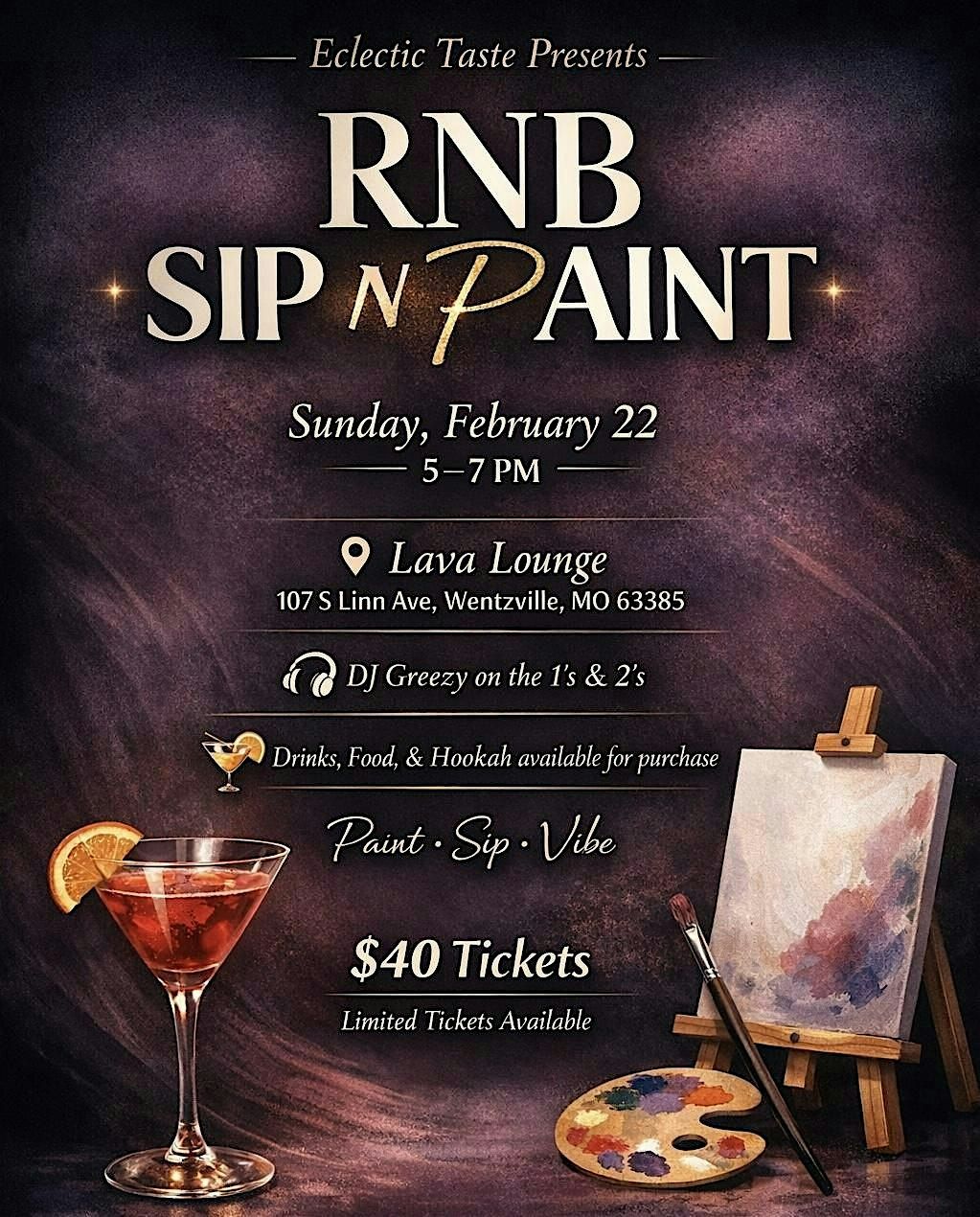 R&B Sip N Paint experience featuring DJ Greezy. Guided painting, cocktails, food, and hookah at Lava Lounge. Come join the fun!