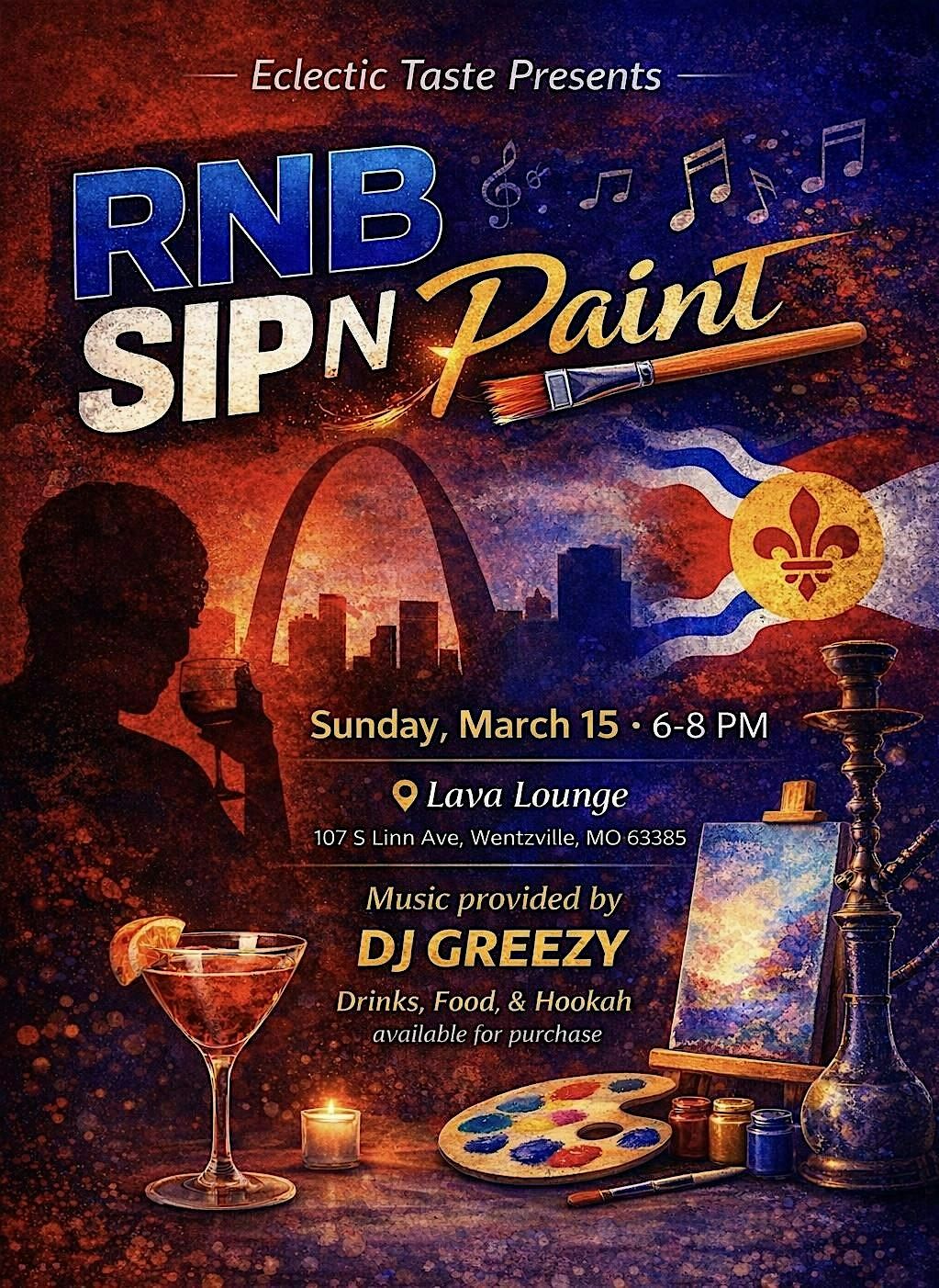 Rnb Sip N Paint @ Lava Lounge in Wentzille, MO. Join us for a live painting class featuring music by DJ Greezy from 6-8pm on Sun. March 15