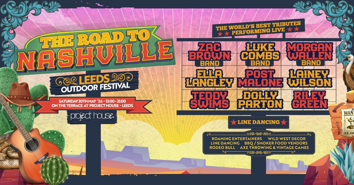 After tearing it up in cities across the country, The Road to Nashville is rolling into LEEDS for a huge outdoor country celebration! 🤠🔥On Saturday 30th May 2026, we’re taking over The Terrace at Project House for an open-air festival packed with world-class tributes to Zac Brown, Luke Combs, Morgan Wallen, Ella Langley, Post Malone, Lainey Wilson, Teddy Swims, Dolly Parton and Riley Green! 🎸🌵
