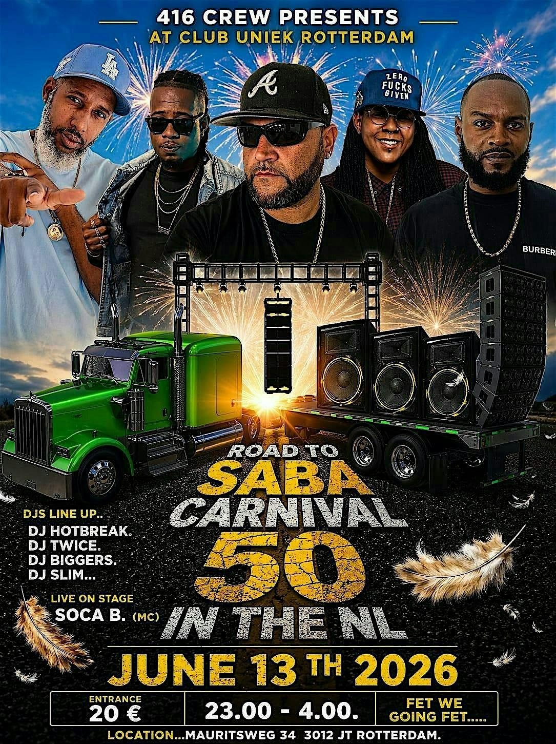 Join us in person as we celebrate 50 years of Saba Carnival! Expect a night full of energy, great music, and unforgettable vibes. Weβre bringing the spirit of Saba straight to you β all you need to bring is your crew, your dancing shoes, and the right energy. Letβs celebrate the past and turn up for whatβs next.