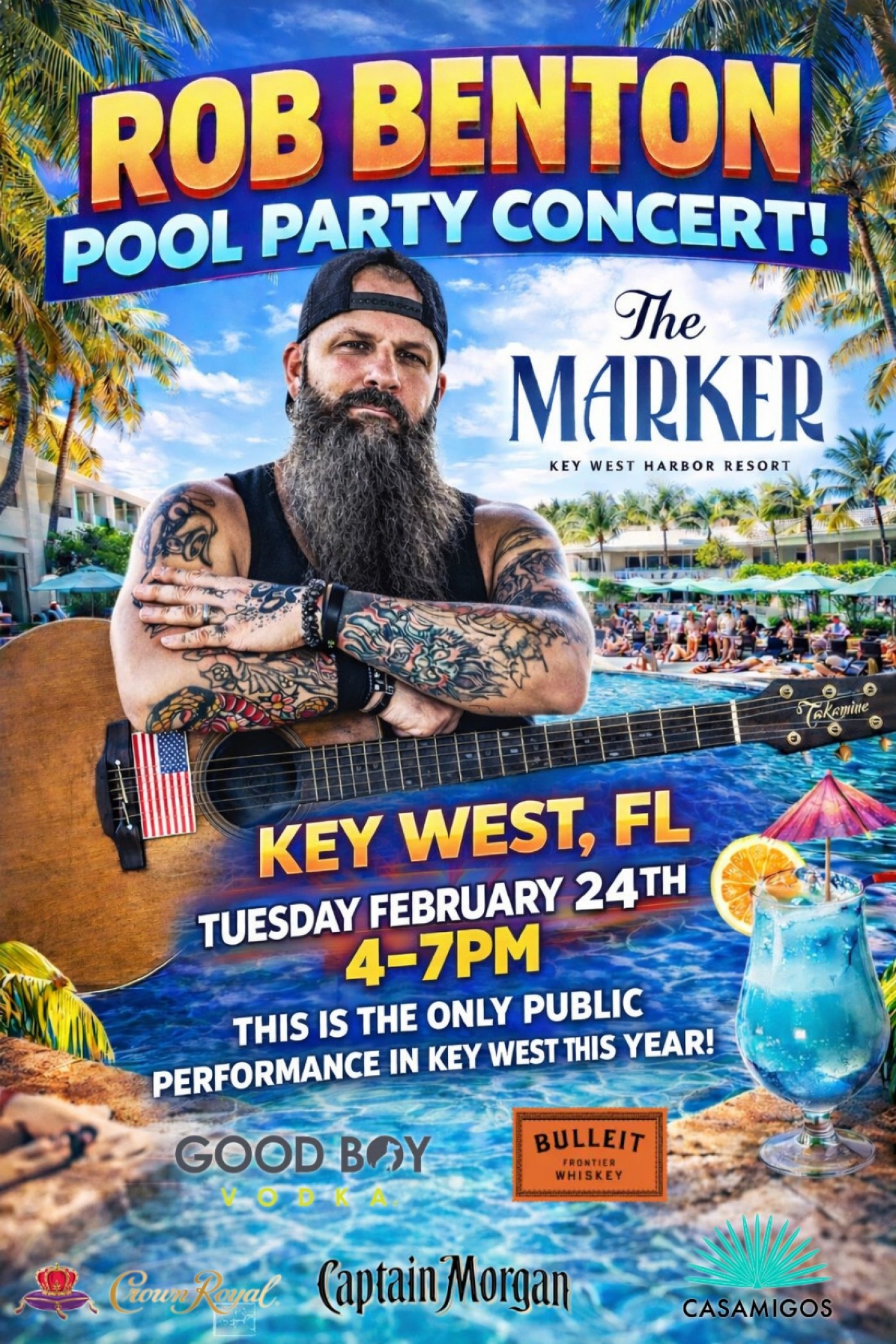 Rob Benton will take the stage at The Marker Key West Harbor Resort for an exclusive live performance on February 24 from 4–7 p.m. Set along the Historic Key West Harbor, the concert will be held at Starboard, the resort’s open-air restaurant and bar known for its relaxed island atmosphere, handcrafted cocktails and local flavors. This marks Benton’s only public performance in Key West this year, making it a can’t-miss event for fans and visitors alike. Open to both resort guests and locals, the waterfront show invites attendees to settle in with a drink, take in the harbor views and enjoy an unforgettable afternoon of live music just steps from Duval Street.