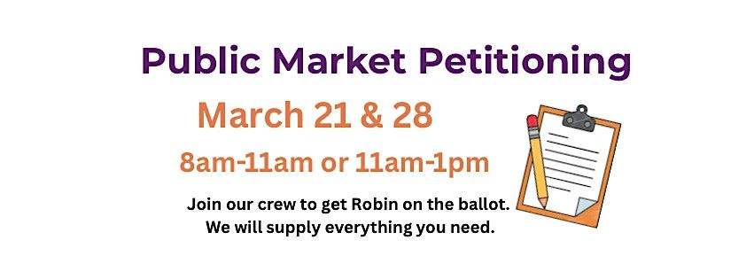 Join our crew to gather signatures so Robin can appear on the primary ballot this June. We will get you everything you need.