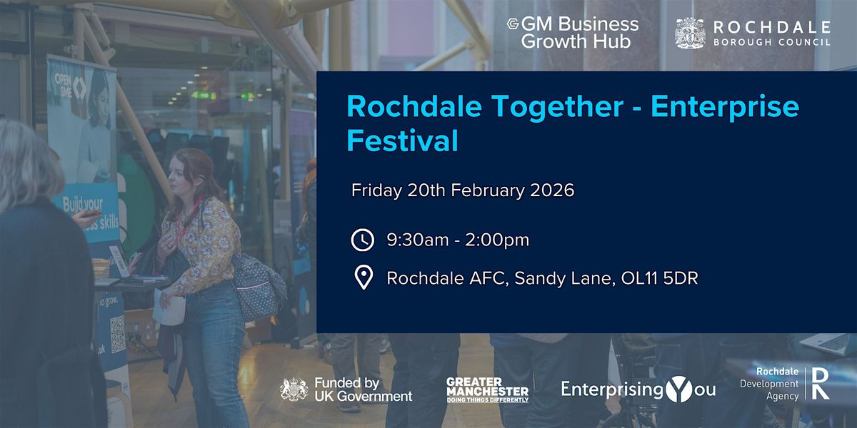 Hosted by GM Business Growth Hub’s EnterprisingYou team, in partnership with Rochdale Council and Rochdale Development Agency, this event brings together local entrepreneurs, support organisations and industry specialists for a day of ideas, learning and collaboration. The festival will showcase the very best of Rochdale businesses through guest speakers, expert led workshops and a range of exhibitors.