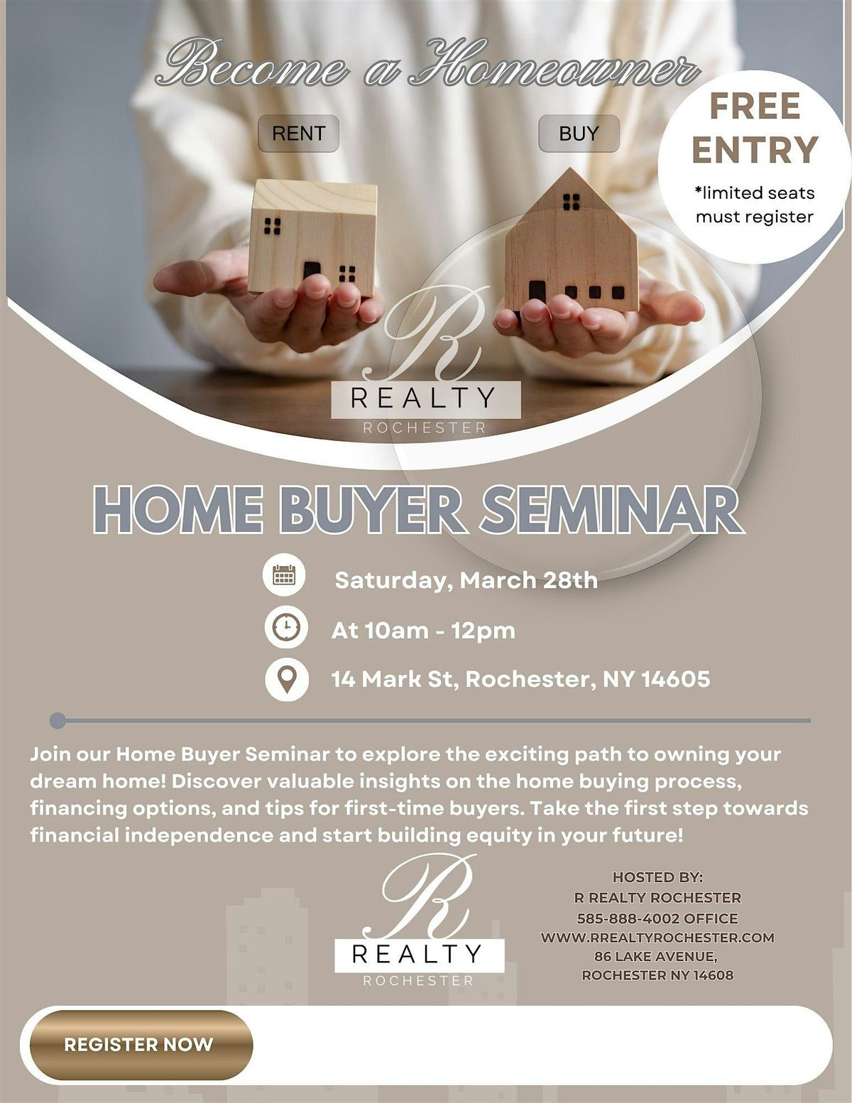 Welcome to the Home Buyer Seminar hosted by R Realty Rochester LLC! Are you dreaming of owning your own home but not sure where to start? Our experienced team will walk you through the home buying process, from getting pre-approved for a mortgage to closing on your dream home. Don't miss out on this valuable opportunity to learn from the experts! Reserve your spot today.