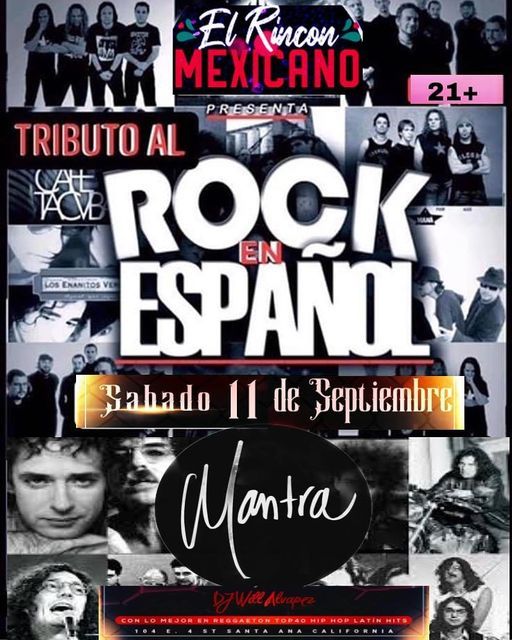 este sabado te esperamos con un tributo al rock en espanol con la banda Mantra Rock live on stage ademas William Alvarez con lo mejor de la musica latina no faltes entrada gratis antes de las 10pm