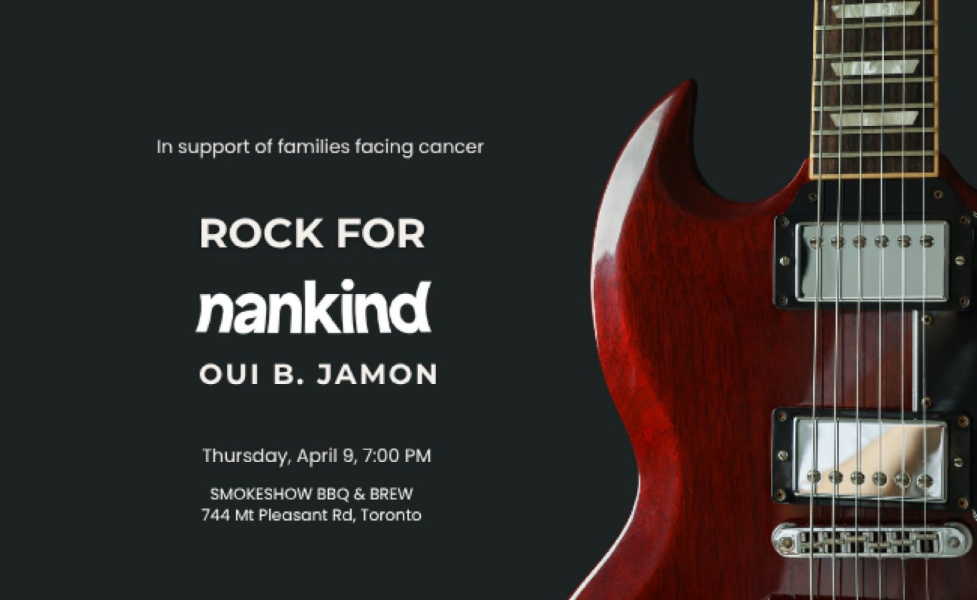 Join us at Smokeshow BBQ & Brew for an evening filled with live music, community spirit, and meaningful impact. Your $20 ticket grants you entry to see Oui B. Jamon perform live while supporting Nankind’s mission of transforming the lives of families facing cancer.
