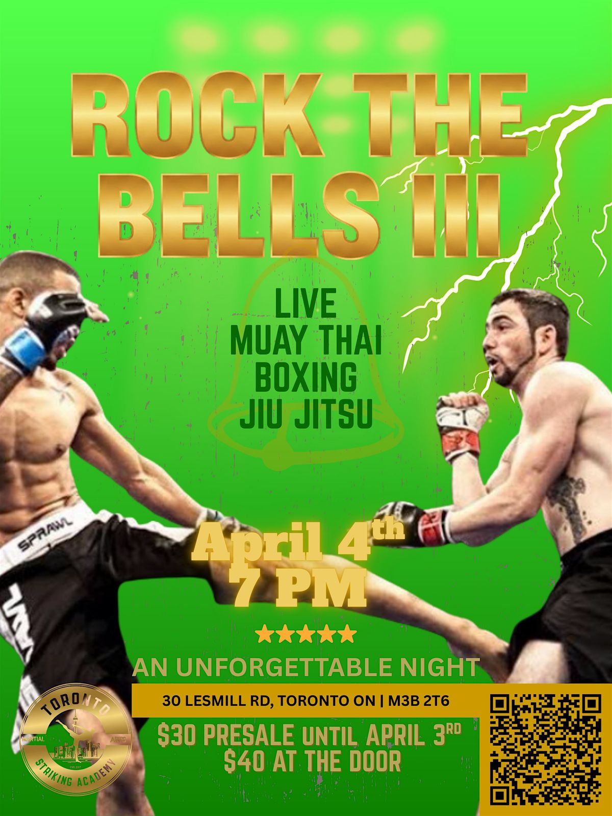 Join us Saturday April 4th (7-10pm) at (30 Lesmill road, unit 5) for an unforgettable night : Live Muay-Thai, Boxing, Jiu-Jitsu & MusicAbout this Event