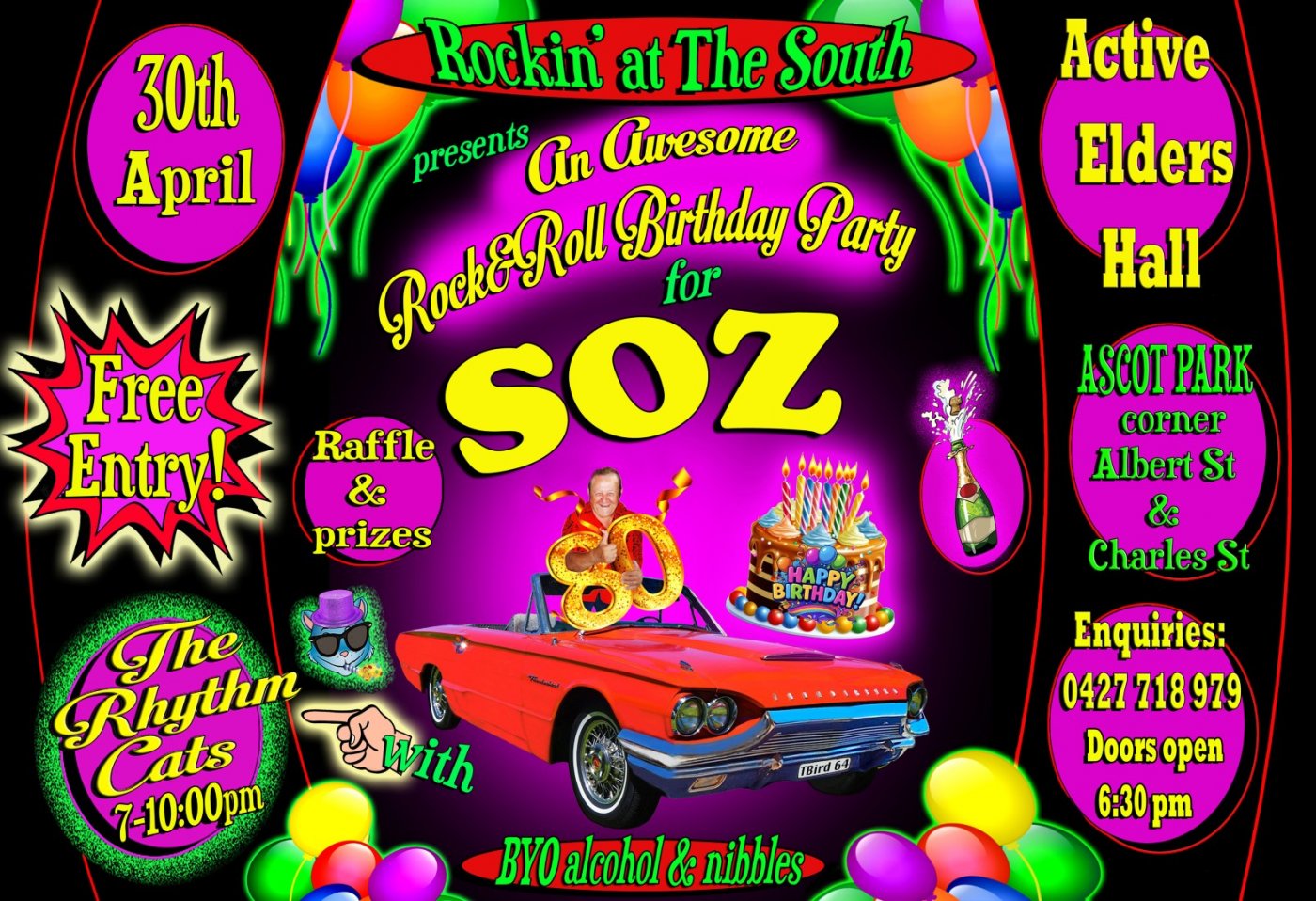 THE RHYTHM CATS will rock the joint 7.00-10.00 pm for SOZ’s 80th BIRTHDAY BASH