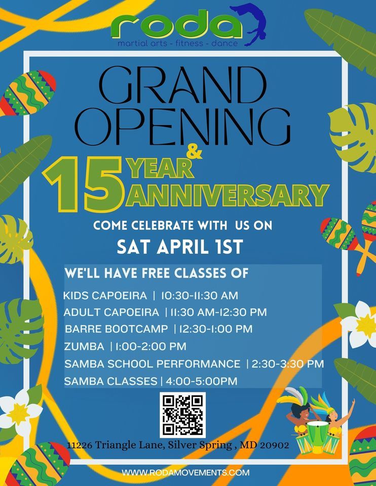 Roda's Grand Opening in Wheaton and 15 Year AnniversaryCome celebrate our grand opening and the 15 year anniversary of Roda Movements at our new location in Wheaton, MD (11226 Triangle Lane, Silver Spring). Celebrate with us all day as we offer free Zumba, barre fitness, samba dance and capoeira classes and samba performances. We will also have class packages and memberships at a discounted price for our Spring fitness and capoeira classes. Over the years, Roda Movements has shared its special brand of fitness, cultural dance programs and martial arts with the DMV area and we want to show our appreciation - as well as our excitement - for our move to Wheaton. Come join us!