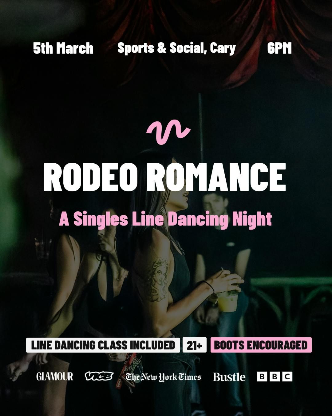Join us at Sports & Social in Cary for Rodeo Romance, a singles night with beginner-friendly line dancing, country vibes, and a private space just for our group upstairs.