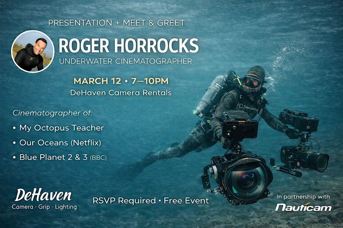 Roger is world renown as one of the best underwater cinematographers of his time. He was the Director of Photography for the Academy Award winning documentary My Octopus Teacher, as well as the recent Our Oceans (Netflix) and Blue Planet 2 & 3 (BBC). Come to meet Roger and enjoy his presentation on his work and experience working on My Octopus Teacher. There will be refreshments and bites as well as a reception after the presentation to meet Roger. Nauticam will be on hand to show off some of their underwater housings and more guest and sponsors to be announced soon.