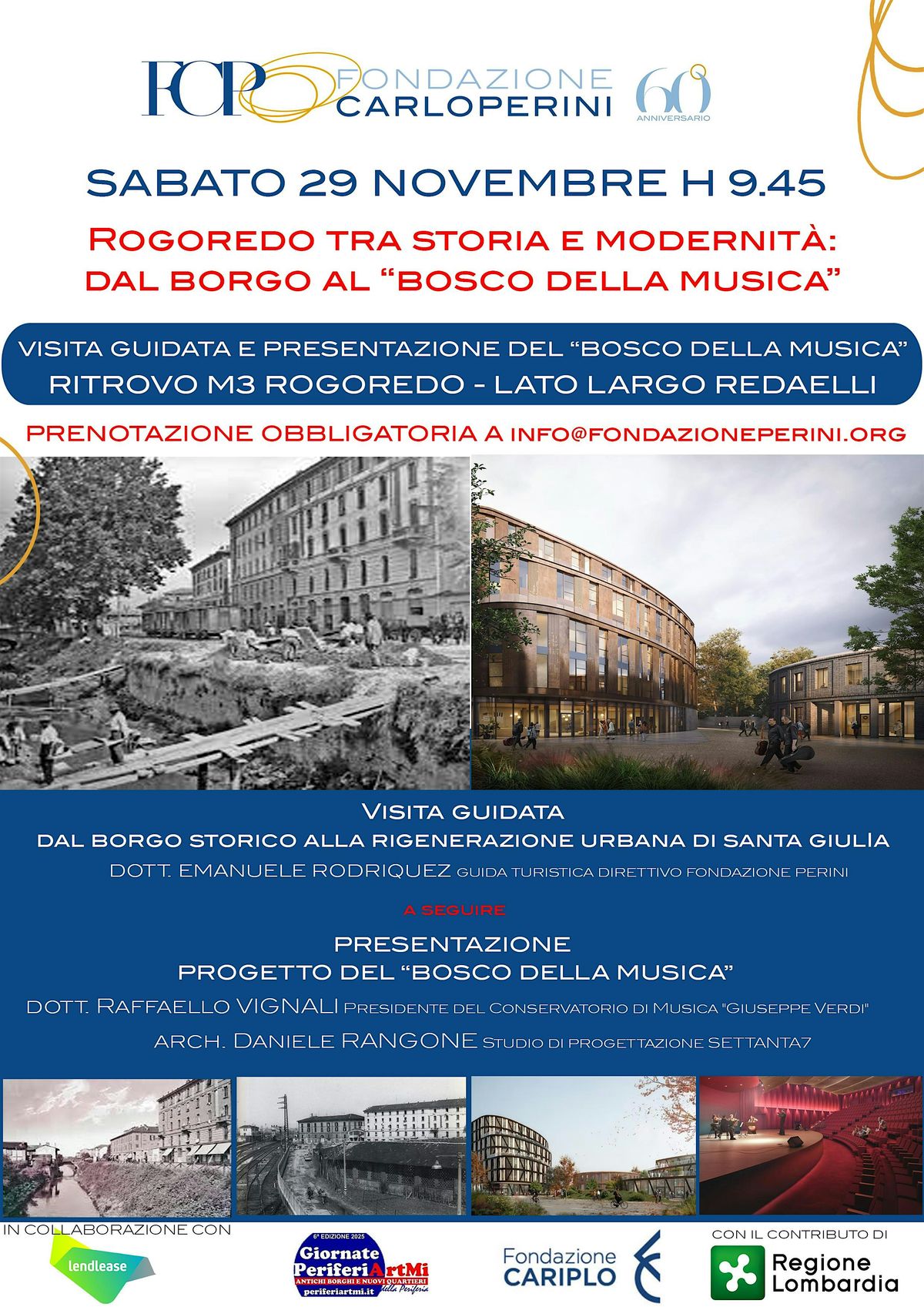La Fondazione Carlo Perini sempre attenta al tema della memoria storica e della rigenerazione urbana, invita i cittadini a questo EVENTO UNICO che vi farà conoscere la storia dell'antico borgo di Rogoredo con la Chiesa della Sacra Famiglia e i progetti di rigenerazione urbana dell'area Santa Giulia, con particolare riferimento all'intervento del Conservatorio di Milano col "Bosco della Musica".