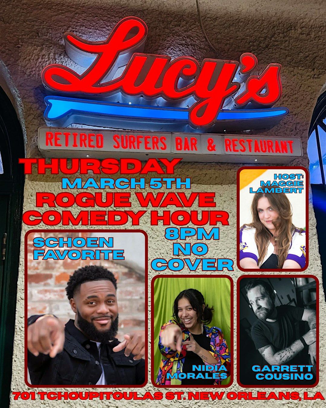 Join us Thursday, March 5th, for the Rogue Wave Comedy Hour brought to you by Lucy's Retired Surfers Bar and Restauran. Come see the BEST that New Orleans has to offer for local comedy right here in the CBD ! No cover, show starts at 8PM, the bar AND kitchen will be open. RSVP NOWWWW !
