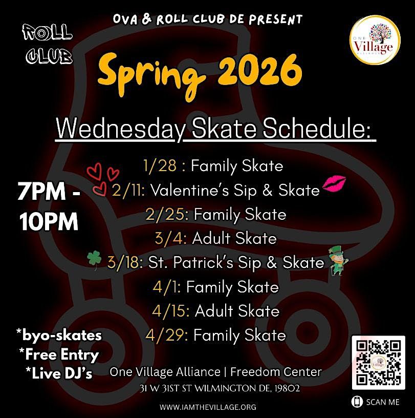 One Village Alliance is super excited to announce a new partnership with RollerBabyBreezy to host the only Roll Club in Delaware. Join us for our Roll Club which will meet every Wednesday at the One Village Alliance, The Freedom Center! Lace up your skates and get ready to groove to some awesome tunes by DJ Sondaeblu in a safe skating environment. Whether you're a beginner or a pro, this in-person event is perfect for all skill levels. Glide around the rink, show off your moves, and have a blast with friends and family. Don't miss out on the fun! Grab your skates and join us every week for Roll Club Wednesday's!