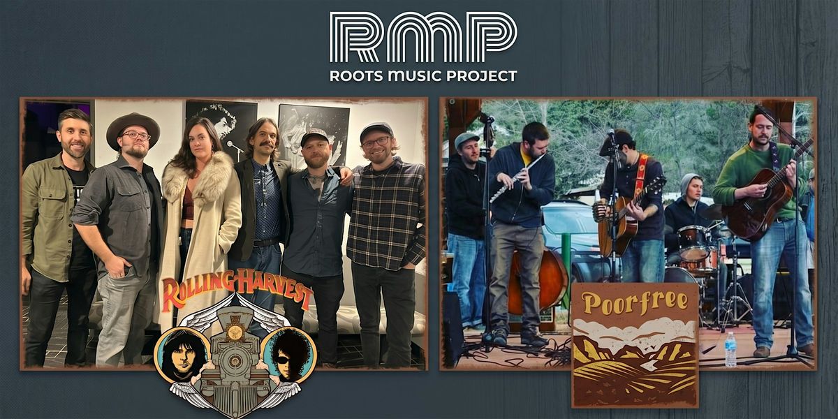 Get ready for a roots music double-header at Roots Music Project! Rolling Harvest brings together veterans of Colorado's most beloved bands to honor the legendary songbooks of Bob Dylan and Neil Young. Then Poorfree takes the stage with their signature acoustic/electric sound — heartfelt originals and crowd-moving covers straight from the mountains of Boulder County. Two bands, one great night of music.