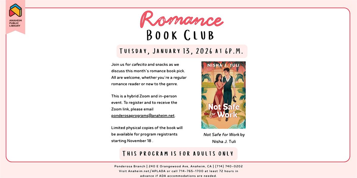 Join us for cafecito and snacks as we discuss this month’s romance book pick. All are welcome, whether you’re a regular romance reader or new to the genre.