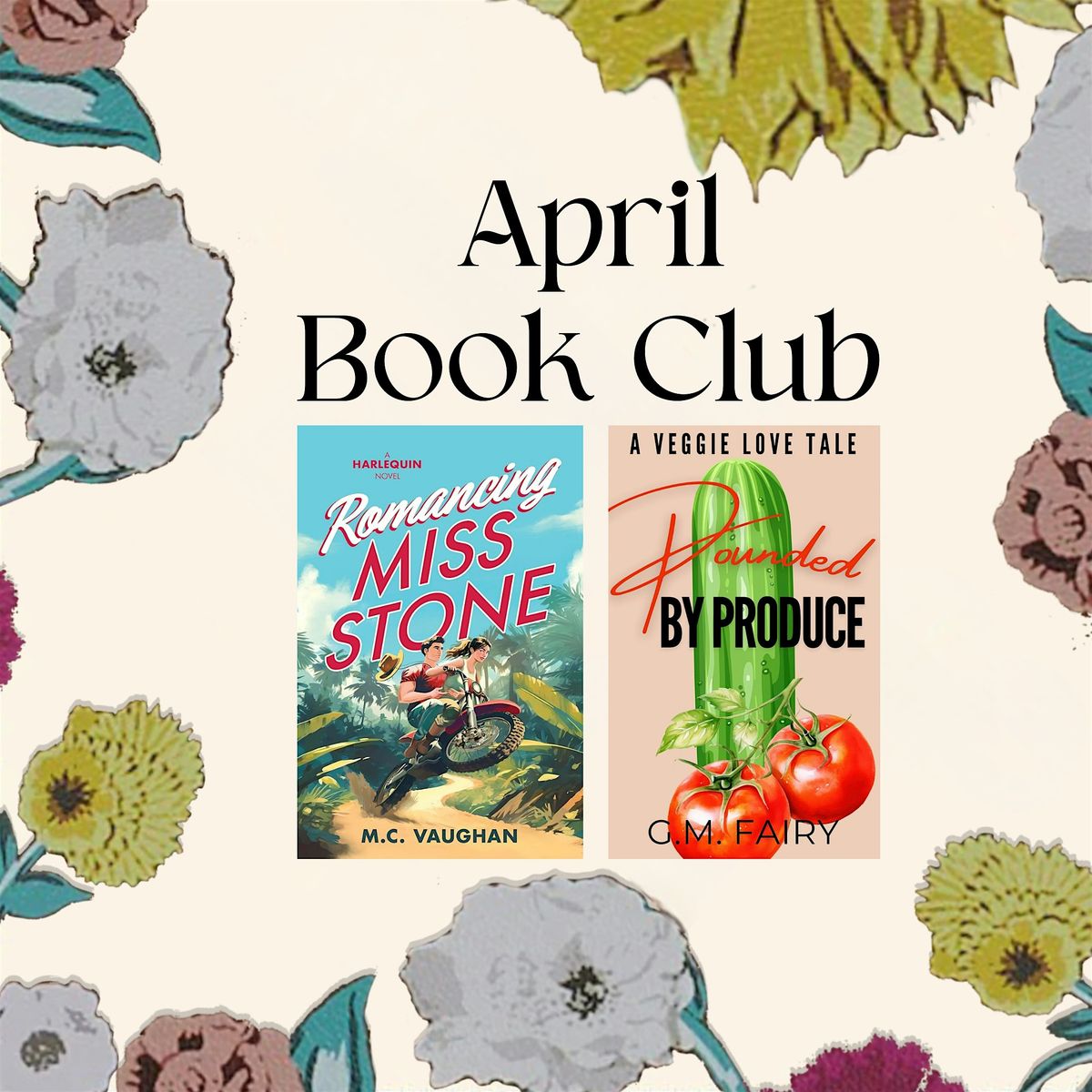 Our next book club meeting is Thursday, April 9th! We're reading Romancing Miss Stone by M.C. Vaughan and Pounded by Produce by G.M. Fairy.