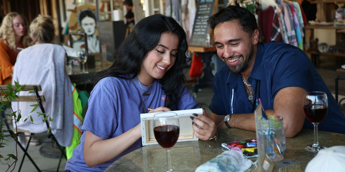 Sip complimentary champagne, mimosas, sparkling apple cider, or tea while you create, either in our cozy gallery space or outside under twinkling patio lights. Our in-house artists will be at hand with bottomless paint, art supplies, guidance, and tips to help you feel confident (no experience needed).