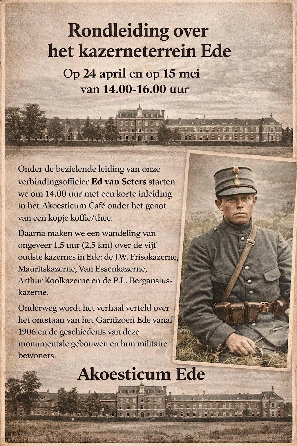 Daarna maken we een wandeling van ongeveer 1,5 uur (2,5 km) over de vijf oudste kazernes in Ede: de J.W. Frisokazerne, Mauritskazerne, Van Essenkazerne, Arthur Koolkazerne en de P.L. Bergansius-kazerne.