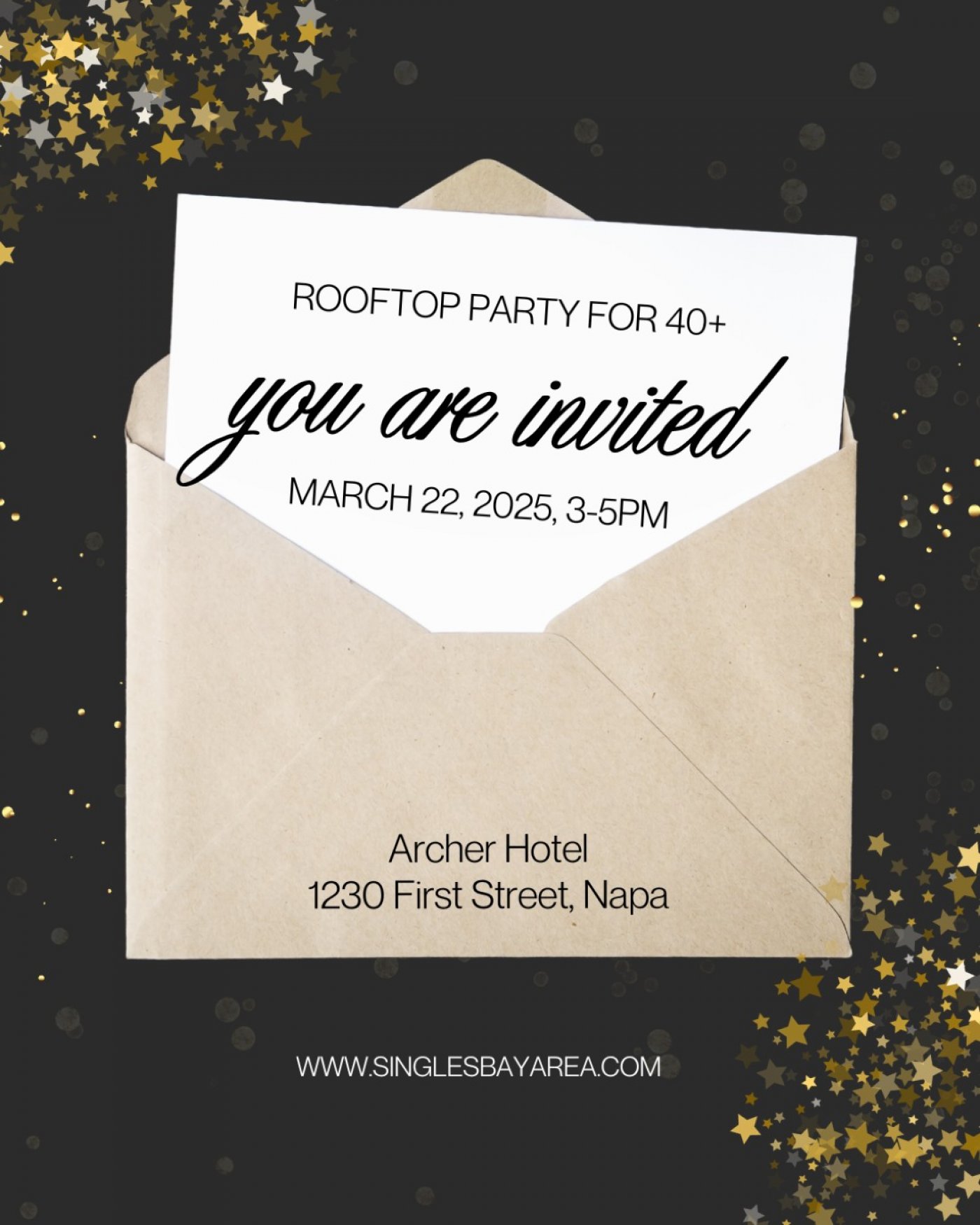 Meet new single friends, 40+, at Napa’s most beautiful boutique hotel! Dress to impress. Sunday, March 22, 2026, 3-5pm.