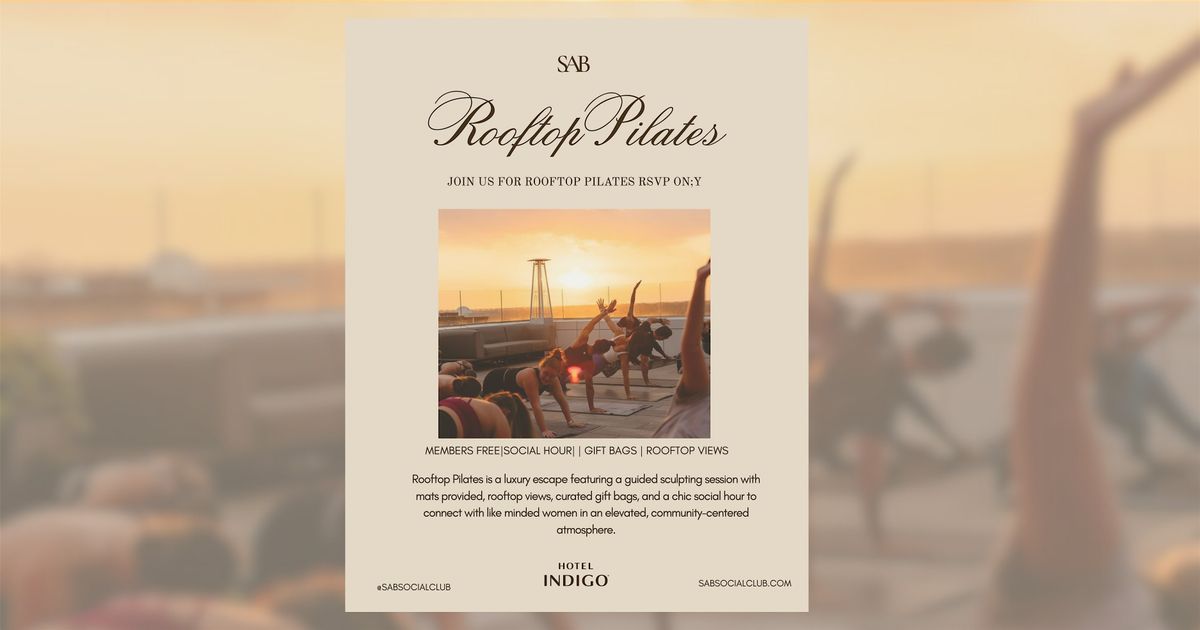 Rooftop Pilates is a luxury escape featuring a guided sculpting session with mats provided, rooftop views, curated gift bags, and a chic social hour to connect with like-minded women in an elevated, community-centered atmosphere. FREE FOR SAB MEMBERS.