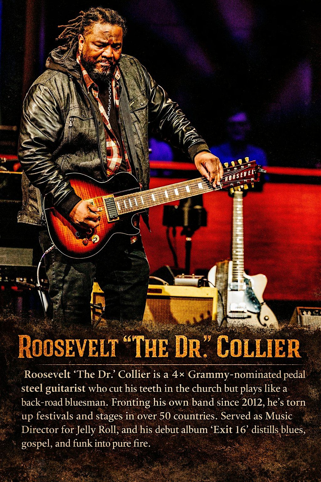 Soft spoken by nature, South Florida-bred ROOSEVELT COLLIER does his hollering on the pedal steel guitar. Brought up in the "sacred steel" tradition of the House of God Church, Roosevelt built his reputation alongside his uncles and cousins in The Lee Boys, known for their spirited, soul-shaking live performances. Seated front and center, "The Dr." leaves an indelible mark on listeners, flooring audiences with his lightning-fast slide work on the pedal steel.