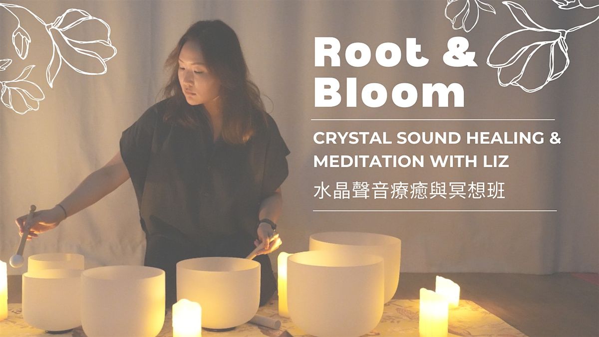 Root & Bloom | Crystal Sound Healing & Meditation with Liz includes breathing exercises, guided meditation, a crystal bowl sound bath, and a unique AQIVE product experience to promote relaxation, mindfulness, and emotional balance.
