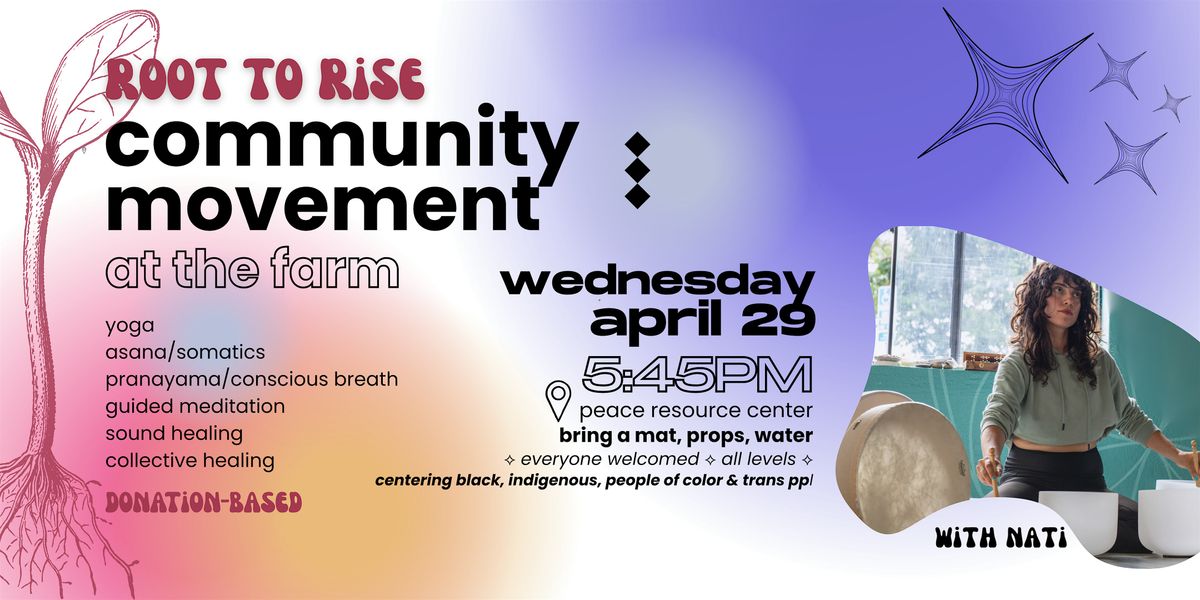 Join us for an evening of deep restoration at the Peace Resource Center with Arif Collective. This is a holistic journey designed to bring you back to yourself while rooted in the heart of our growing farm community.