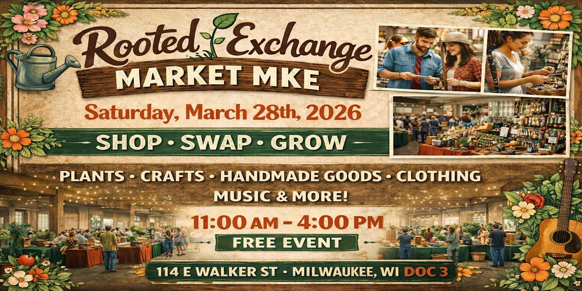 Rooted Exchange MKE is a free, community-centered vendor market happening Saturday, March 28, 2026, from 11:00 AM – 4:00 PM at Dock 3 in Harbor View.