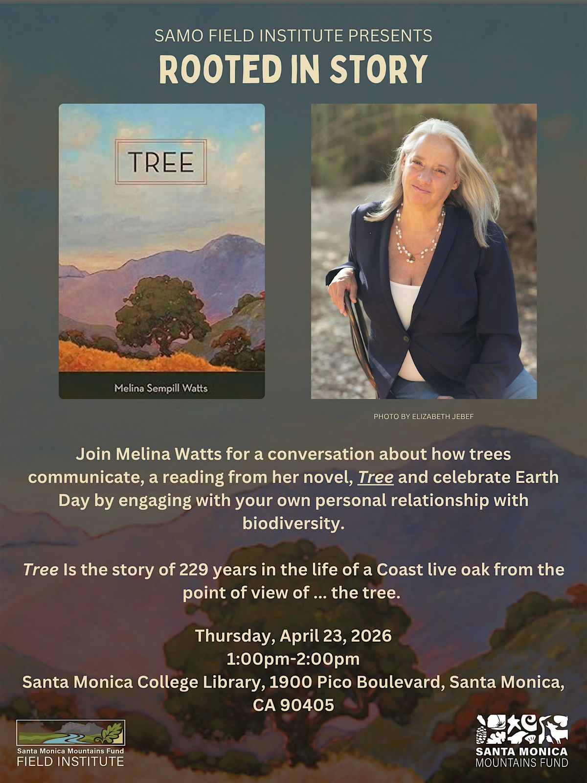 Join SAMO Fund Field Institute and Melina Watts for a conversation about how trees communicate, a reading from her novel, and celebrate Earth Day by engaging with your own personal relationship with biodiversity.
