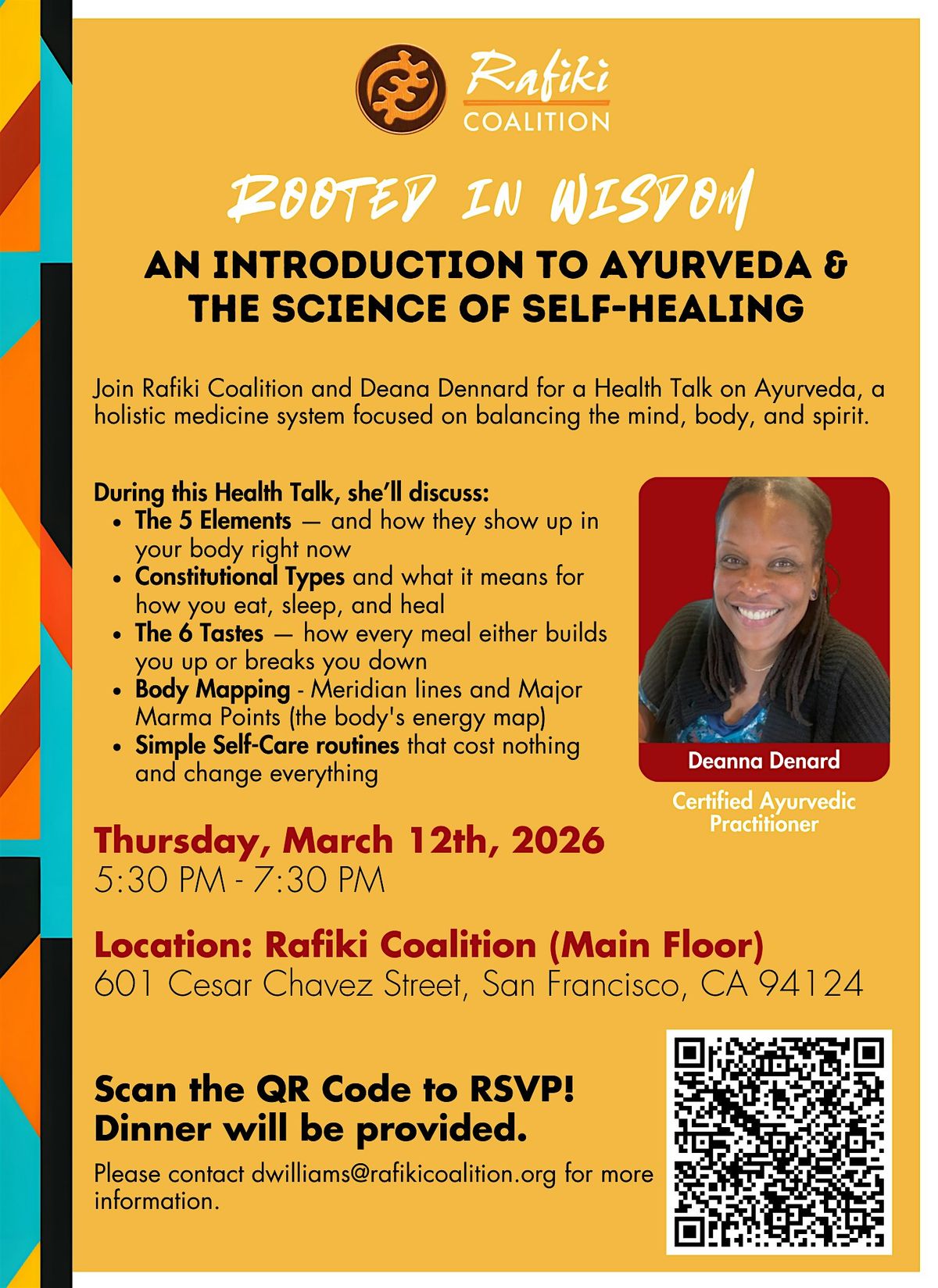Join Rafiki Coalition and Deana Dennard for a Health Talk on Ayurveda, a holistic medicine system focused on balancing the mind, body, and spirit.