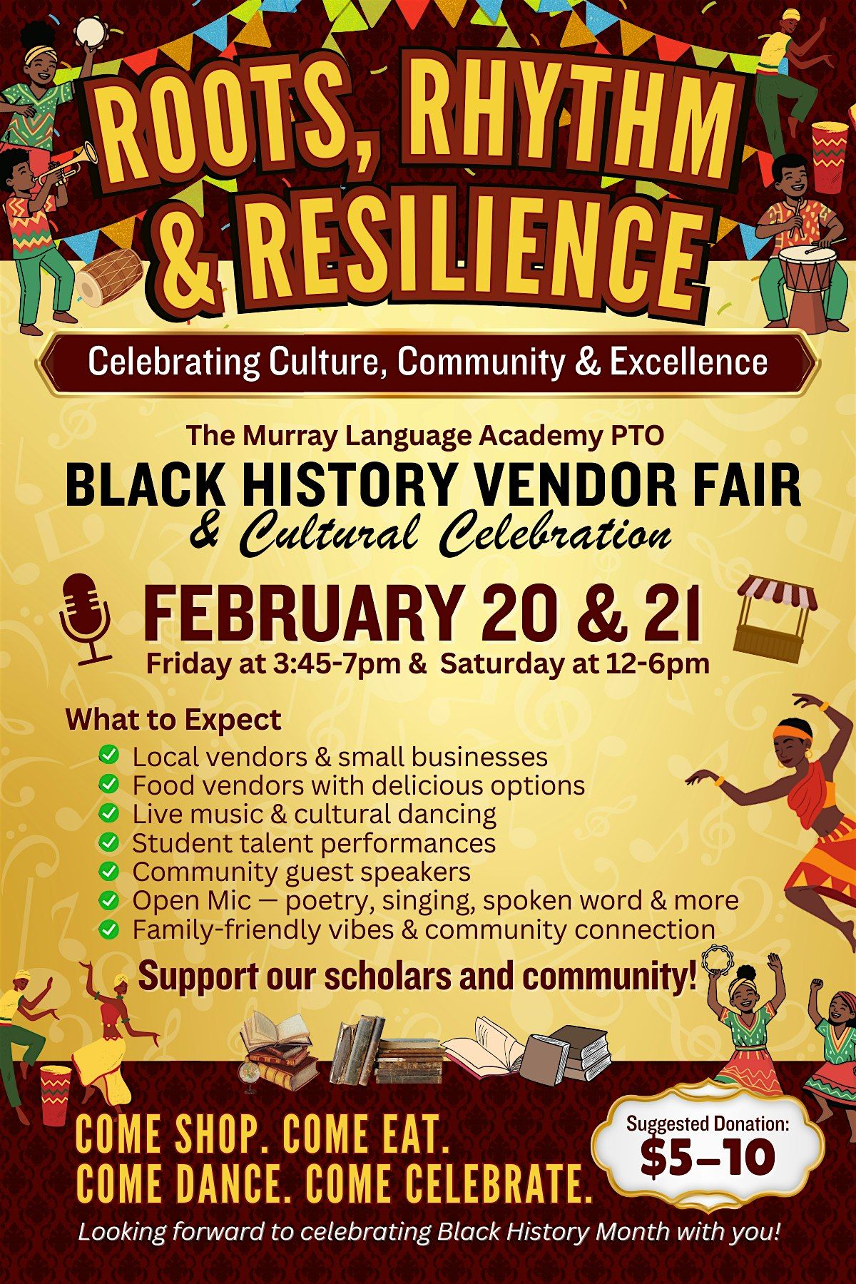 Come vibe with us at the Roots Rhythm & Resilience Black History Vendor Fair! It's an in-person celebration full of amazing vendors, culture, and community spirit. Discover unique crafts, delicious eats, and stories that honor Black history and resilience. Don’t miss out on this awesome chance to support local Black-owned businesses and feel the rhythm of our roots!