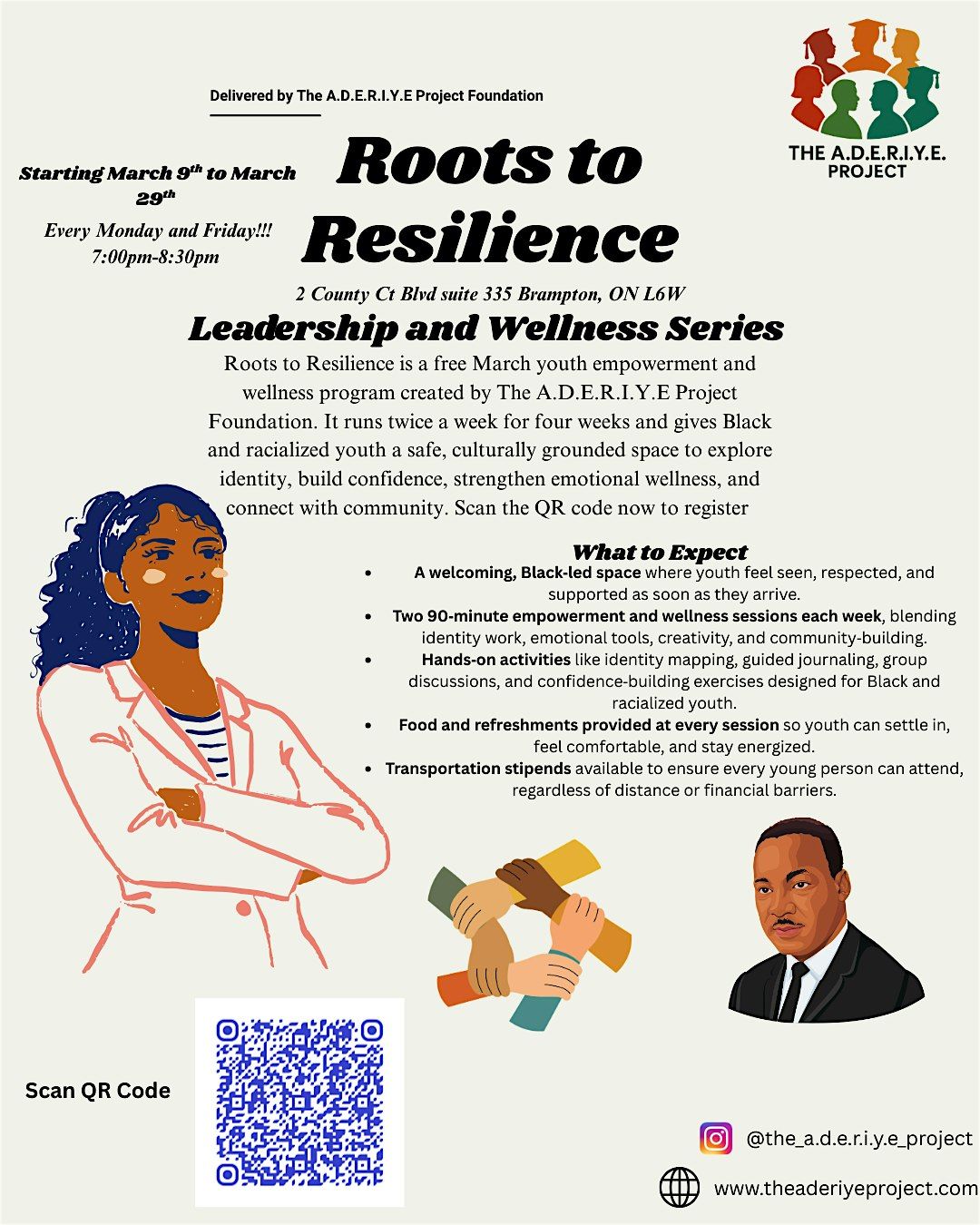 Roots to Resilience is a free March youth empowerment and wellness program created by The A.D.E.R.I.Y.E Project Foundation for Black and racialized youth in Brampton. Designed as a twice‑weekly, 90‑minute community experience, the program offers a welcoming, culturally grounded space where young people can explore identity, build confidence, and strengthen emotional well‑being. Each session blends hands‑on activities, guided journaling, group discussions, and creative expression to help youth understand who they are, where they come from, and how to navigate stress, emotions, and everyday challenges. The environment is intentionally warm and supportive, with food and refreshments provided at every session to help youth settle in and feel cared for. Transportation stipends are available to remove barriers and ensure full participation. The program creates a space for belonging, growth, and resilience during a key moment in the school year.