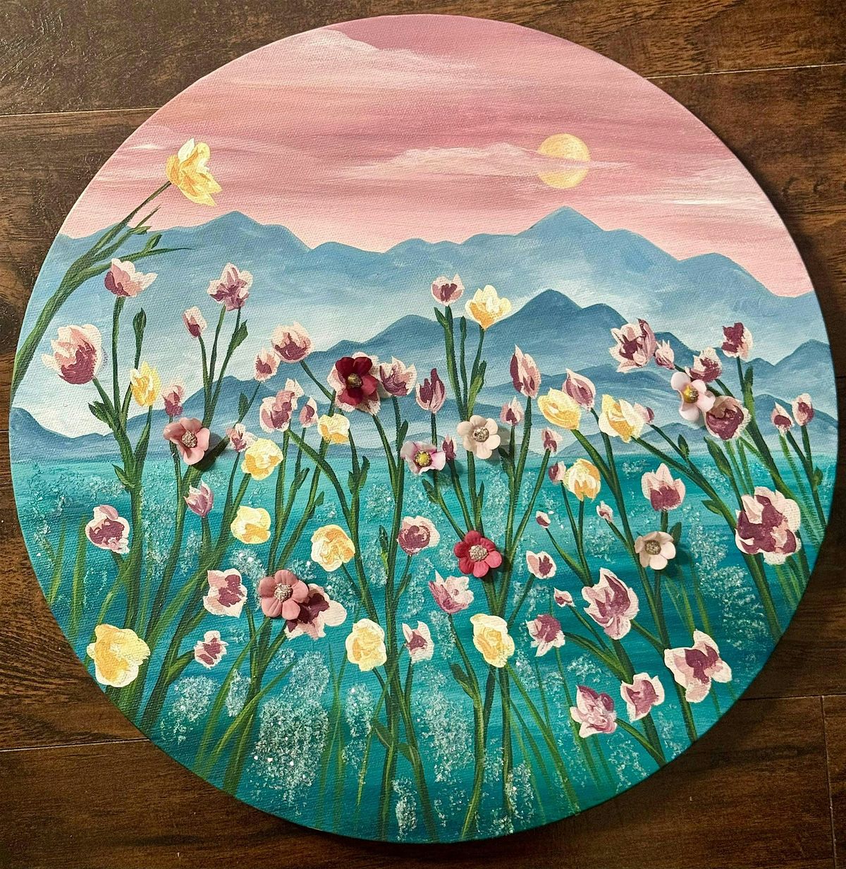 🖼️ One 16" round, wrapped canvas, a variety of paper flowers to choose from, diamond dust and glue for adhering