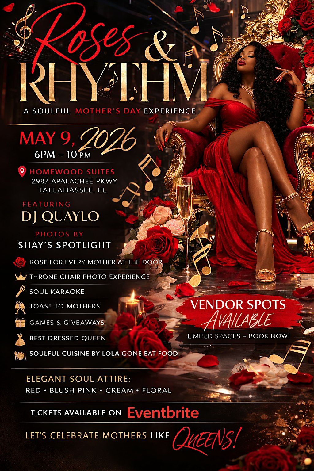 Celebrate Mother’s Day at Roses & Rhythm! Music by DJ Quaylo, throne photos, soul karaoke, great food, and roses for every mom. Vendor spots
