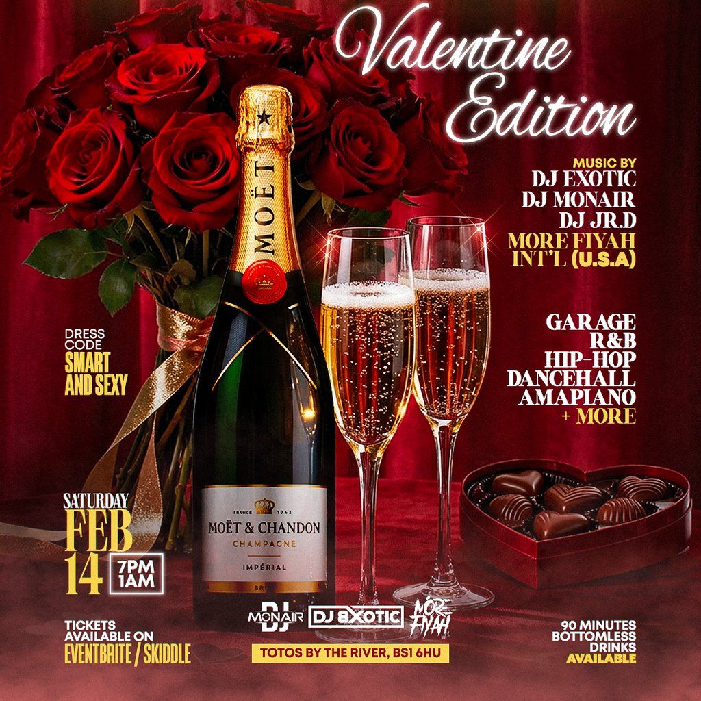 Share, sip and dance the night away. Delicious food, flowing drinks, and the hottest ultimate Valentine's experience.Music Genres : UK Garage, R&B, Dancehall, Hip Hop, Amapiano