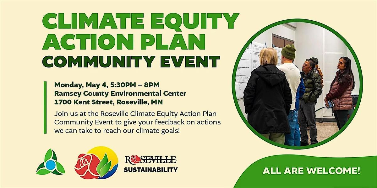 Join us in the community room at the new Ramsey County Environmental Center for an exciting community event focused on creating a more equitable climate future for Roseville! This in-person event will give you a chance to tell us which actions you want us to prioritize first to address climate change. A free meal and a kids' activity table will be provided!