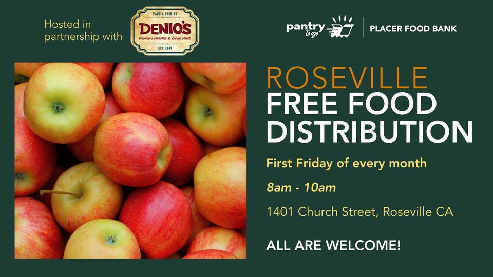 Come to the Placer Food Bank free food distribution located at the Denio's Parking Lot at 1401 Church Street in Roseville. We are so grateful to Denio's Market for helping us bring this distribution to the Roseville community!We are open the 1st Friday of every month from 8am-10am, with plenty of fresh fruits and vegetables, non-perishable items, baked goods, and more to help restock your kitchen during these challenging financial times.