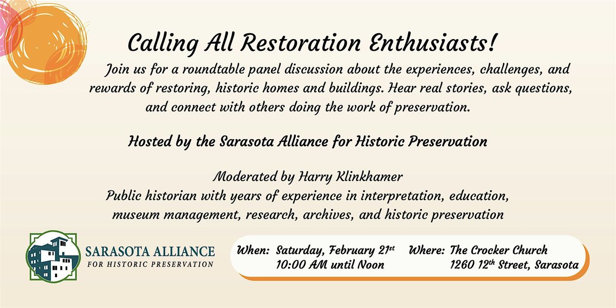 Join the Sarasota Alliance for Historic Preservation (SAHP) for an engaging, moderated discussion that brings together local homeowners and restoration experts who have taken on the rewarding challenge of preserving historic properties in Sarasota and Venice.