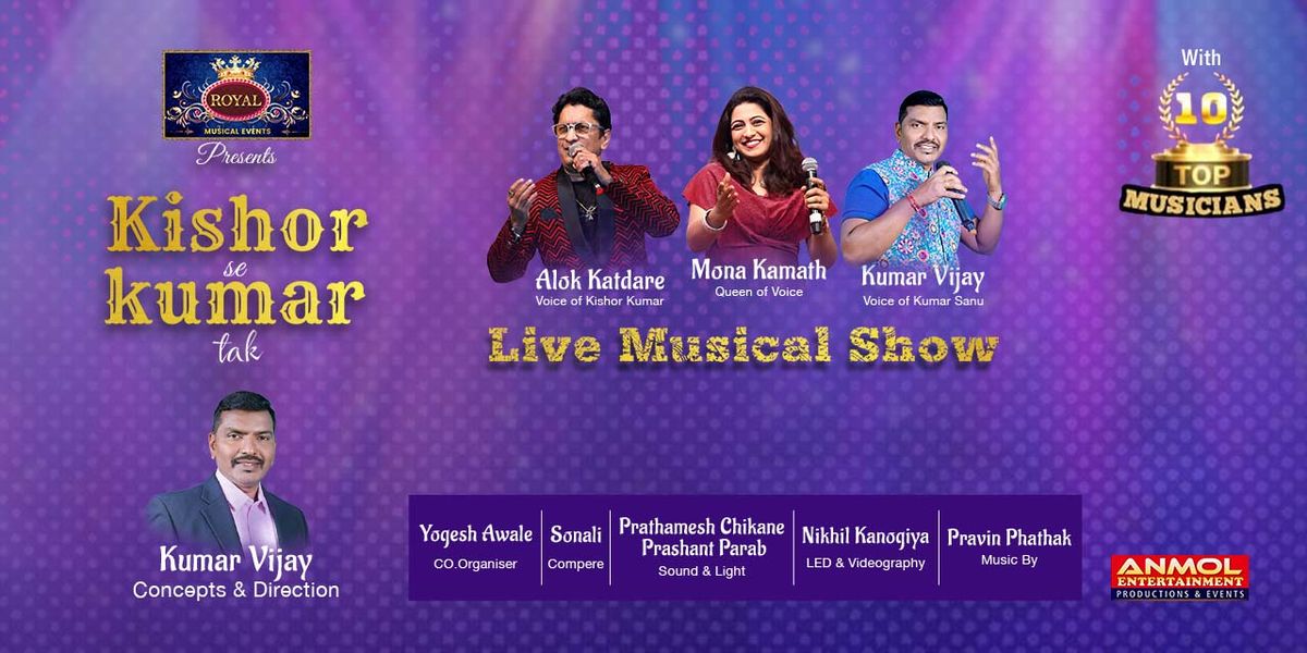 Royal musical events presenting the Grand Musical concert show on 13th March 2026 from 8.30 pm on words, in which star singer and voice of Kishore Kumar Alok Kadir ji and queen of voice Mona kamatji performing with the famous musician team of Praveen Pathak ji with his 10 musicians on the stage. Concept and direction of the amazing singer and voice of Kumar Sanu Vijay Awaleji with his team and best singers poonam Dhumal ji, Gopal kale ji, Prasad Mundravale ji, Pramod Londhe ji with great visionary of entrepreneurship. The show in hosting by multitalented Sonali Suryavanshi ji. And unforgettable musical celebration of love featuring evergreen Bollywood hits of Kishore Kumar to Kumar Sanu in the title of "Kishore se Kumar tak". Relive the magic, fall in love all over again and express your deepest emotions through soulful melodies that have touch million of hearts Relive memories celebrate love and let music express what word can't.