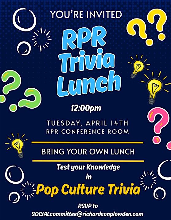 Join us for a fun in-person event where you can test your knowledge of all things pop culture while enjoying your lunch! Whether you're a movie buff, music fan, or just love trivia, this is the perfect chance to show off your smarts and have a blast with friends. Don’t miss out on some laughs, tasty food, and friendly competition!