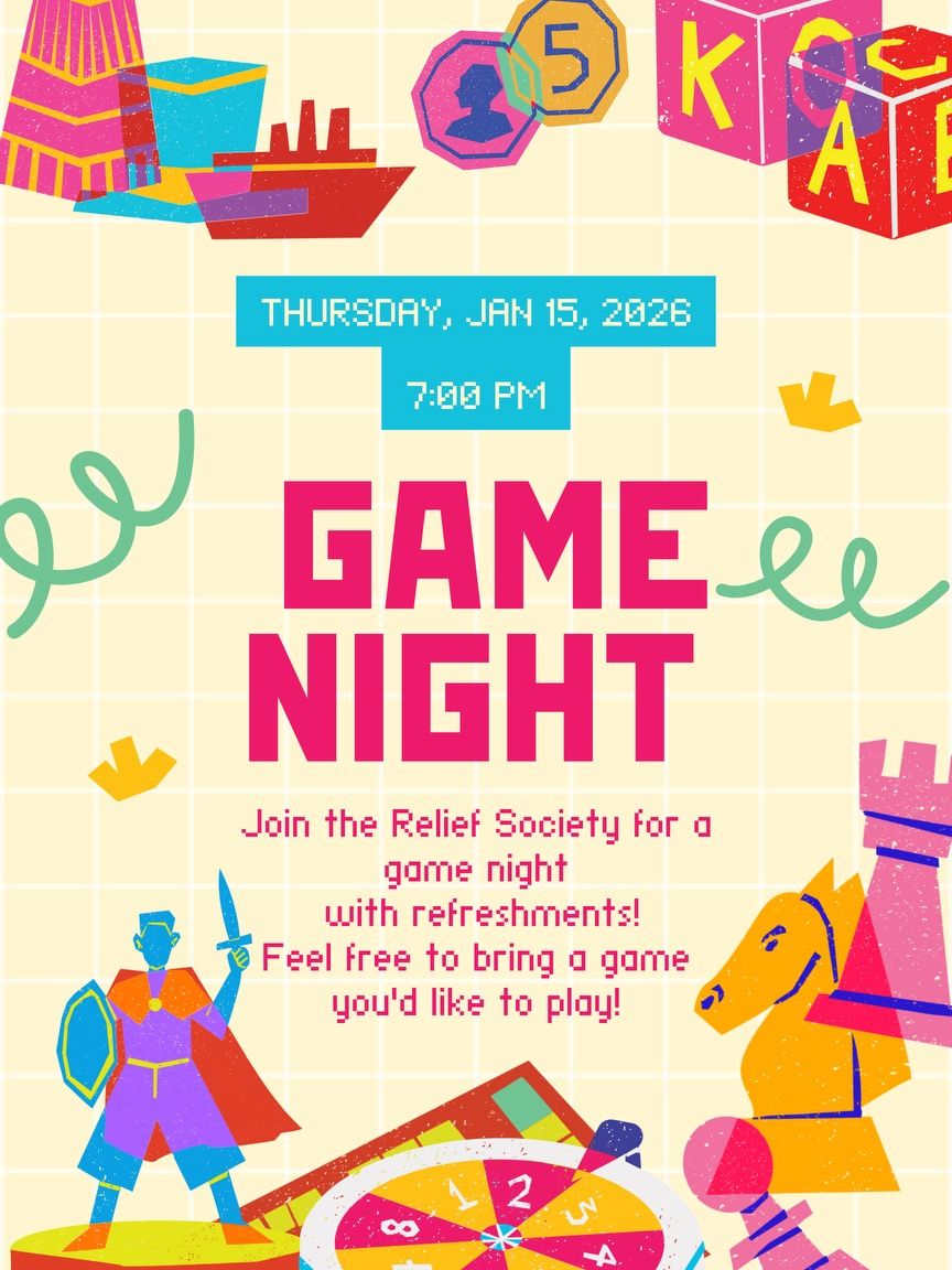 Please Join us for a Relief Society Game Night and Refreshments. Feel free to bring any games you would like to play!