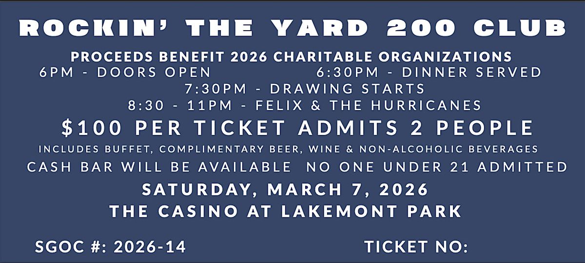 Rockinβ the Yard 200 Club is back on Saturday, March 7, 2026 at The Casino at Lakemont Parkβwith proceeds benefiting 2026 charitable organizations.