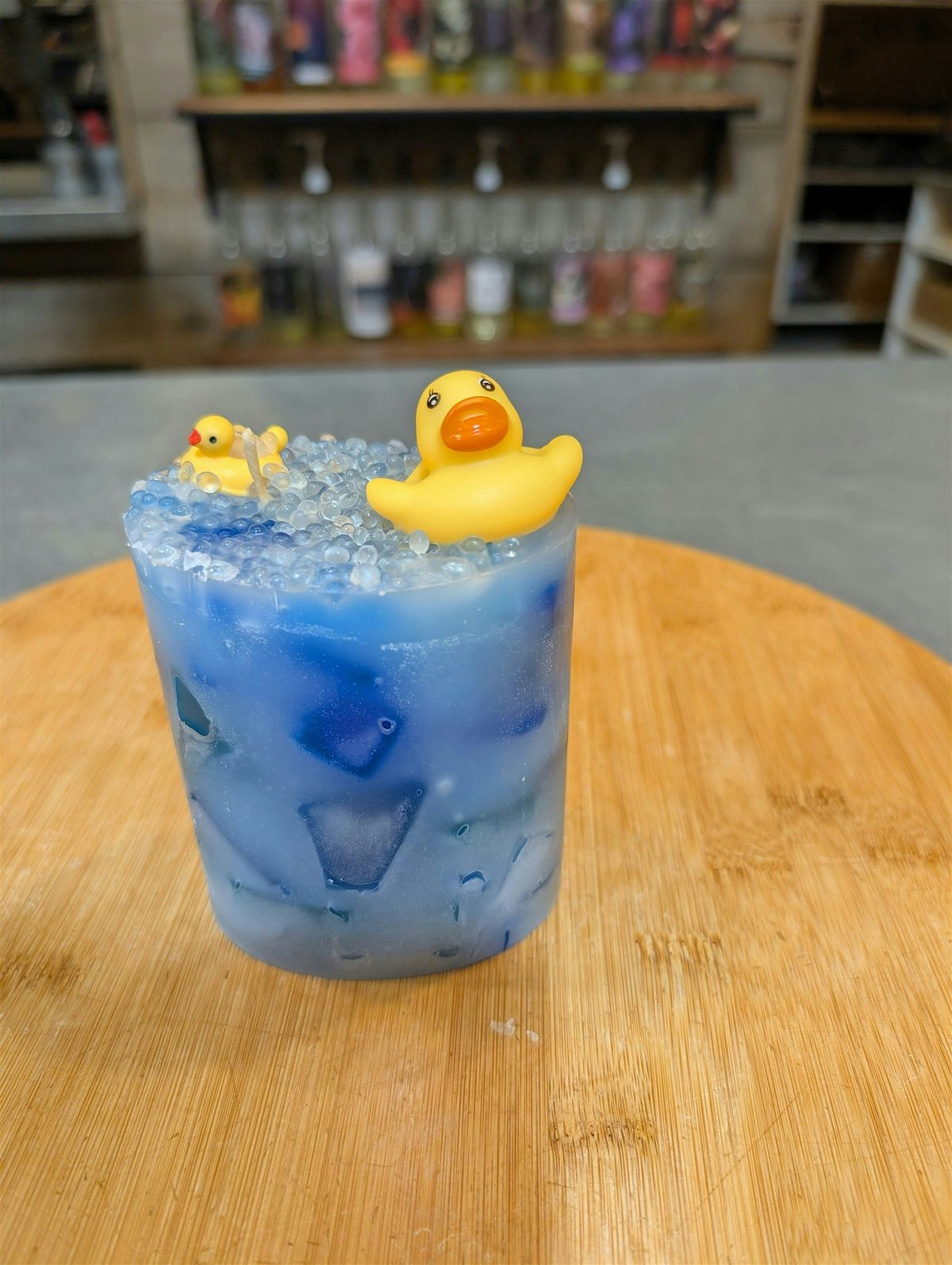 Cost covers medium candle size, 1 rubber ducky, 1 mini duck floaty, glass bead "bubbles"