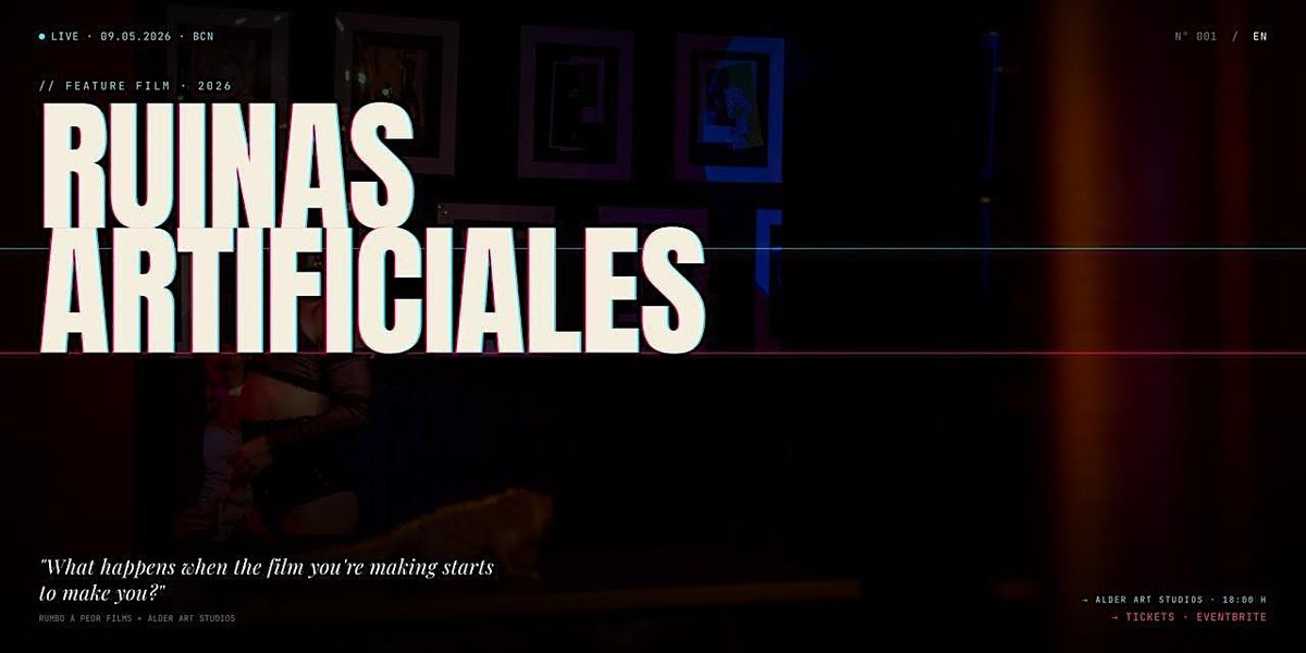 One night in Barcelona. We open the doors of Alder Art Studios for the private screening of Ruinas Artificiales — a feature film about a group of amateur filmmakers whose experimental project gradually destroys their lives, while the fiction they are shooting begins to contaminate the reality they are living. Made in the lineage of Dogma 95 and the Nouvelle Vague, with the latest AI techniques and zero budget, the film asks the question of our era from inside it: what is still human when the machine writes, generates, and edits faster than we can think?