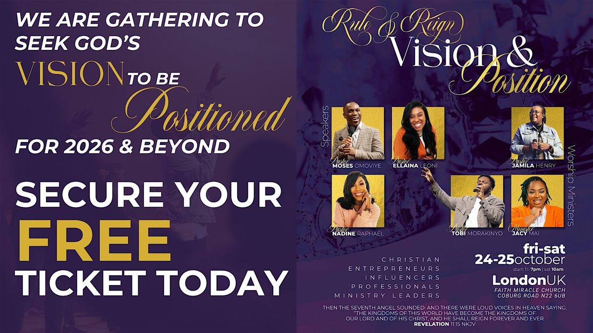 Welcome to the Rule & Reign Conference: Vision & Position! Join us at Faith Miracle Church, step into a prophetic atmosphere where Heaven’s vision becomes your direction for the year ahead. Rule & Reign: Vision & Position is a two-day Kingdom gathering for Christian entrepreneurs, influencers, professionals, and ministry leaders who are ready to align every area of life and assignment with God’s divine strategy for 2026. Over these two days, you will encounter the Presence of God through worship, receive clarity through powerful teaching, and be activated through prophetic ministry to position yourself for the next season.