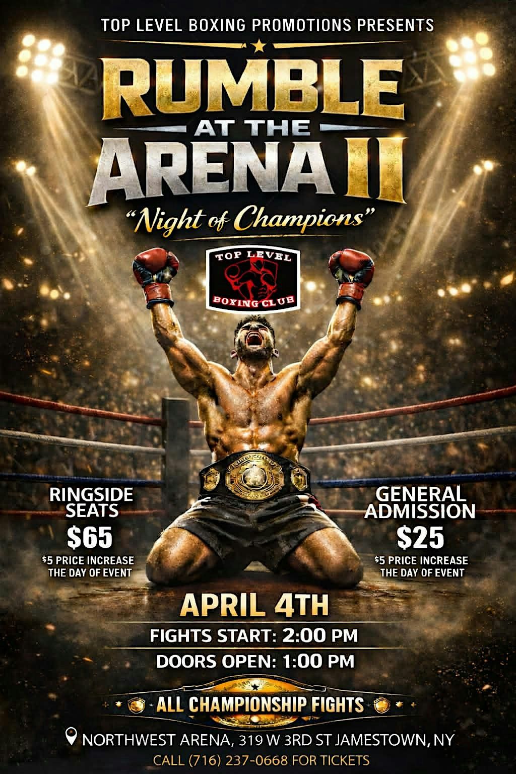 The heat is coming to Jamestown, NY! Get ready for an adrenaline-charged night of championship fights and explosive matchups that will keep you on your feet from the opening bell to the final round. This is live boxing at its finest—raw, intense, and unforgettable.